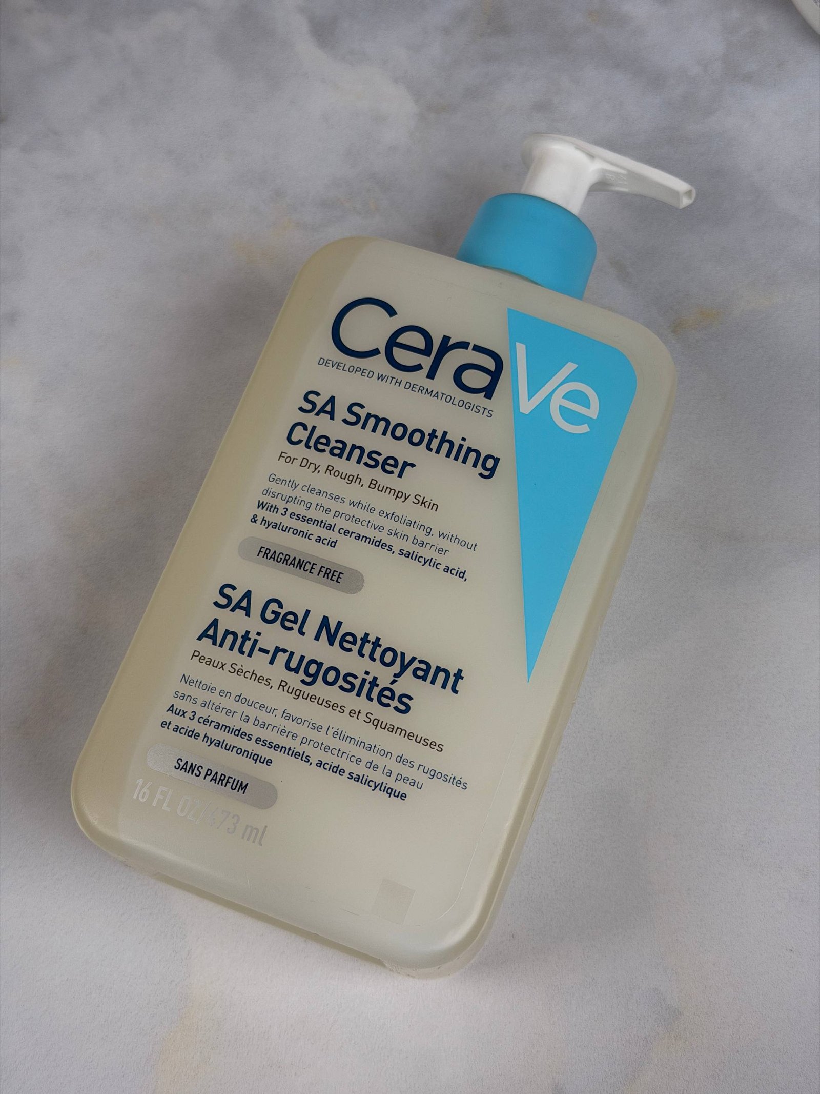 CeraVe SA Smoothing Cleanser (سيرافي إس إيه المنعم للبشرة)، وهو غسول مخصص لتنظيف وتقشير البشرة الجافة والخشنة والمتعرجة بلطف