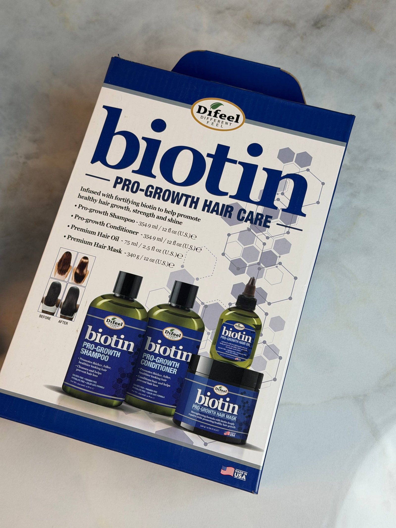 مجموعة Difeel Biotin Pro-Growth للعناية بالشعر بشكل أساسي لتعزيز نمو الشعر وتقويته. تحتوي هذه المجموعة على “البيوتين” (فيتامين B7)، وهو عنصر حيوي يدعم بنية الكيراتين في الشعر، مما يساعد في علاج الشعر الخفيف والضعيف.